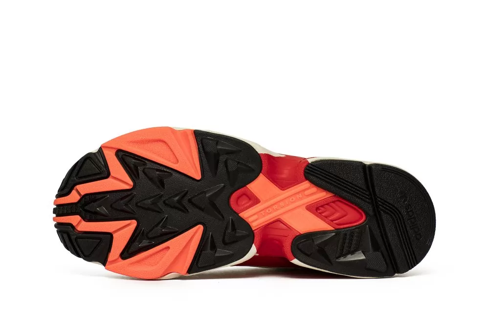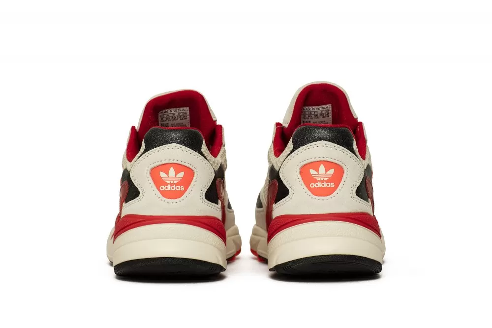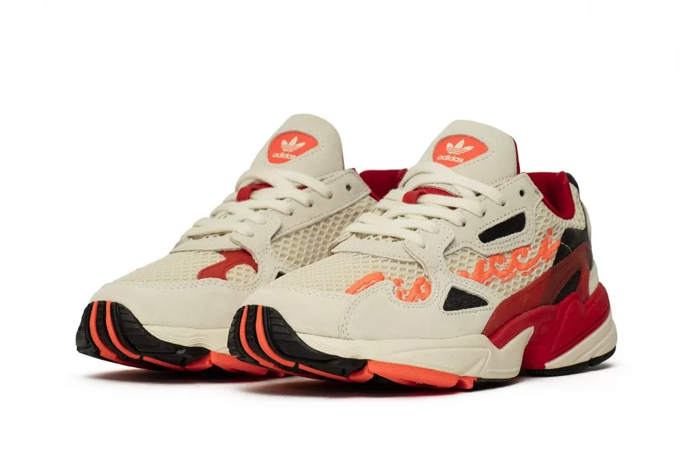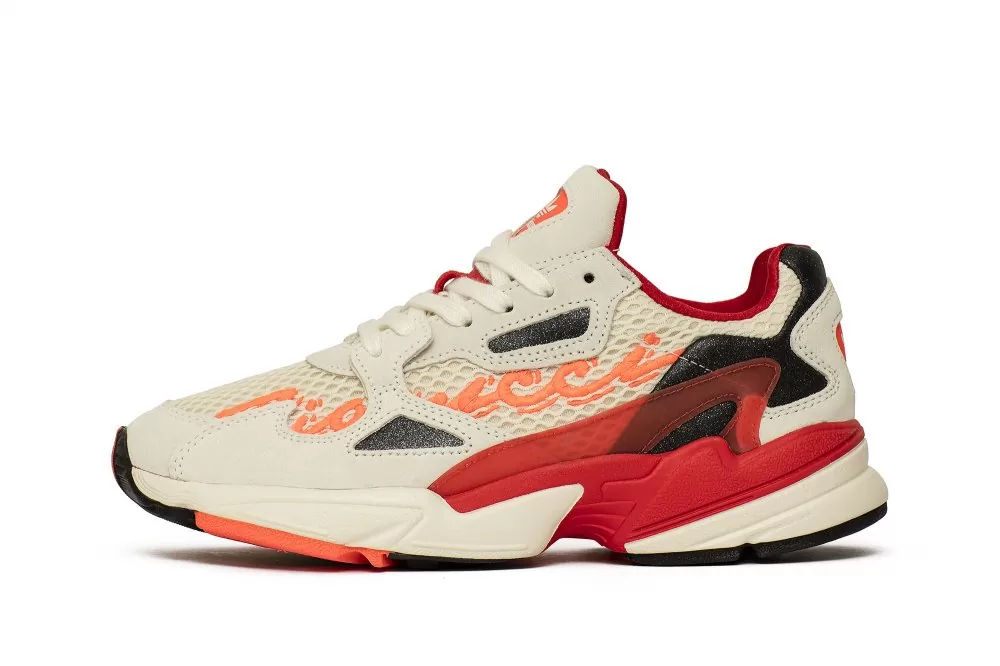 Ограниченная версия модели adidas Falcon, подготовленная в сотрудничестве с модным брендом Fiorucci, известным своим креативным, повседневным и забавным стилем. Верх выполнен из высококачественной кожи серны и сетки из текстильного материала. Все выдержано в светло-сером цвете, который разбит оранжевыми вышитыми логотипами Fiorucci на боковых стенках и красными и черными деталями. Подошва из пенопласта EVA с системой стабилизации кручения закрывает дизайн.